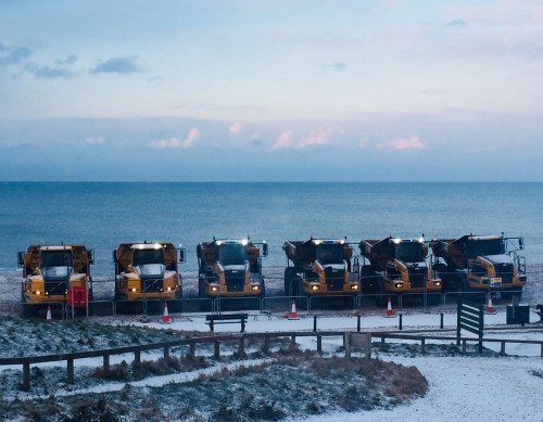 As we look out over the sea each morning, six yellow dump trucks begin their 10 hour shift, driving the shingle from the groyne at Splash Point and moving it westwards to Newhaven harbour. Men arrive early in Ovenden vans, wearing hard hats and dressed in orange workgear which reminds me of Guantanamo bay.