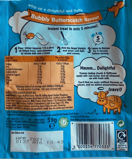 I’m really in love with Angel Delight, especially the butterscotch flavour. What a magical new product this is! Add milk to the powder, then whisk until it thickens to peaks of buttery, sugary, foamy chemical alchemy – it’s finger licking delicious. But what is it made from? There are no clues on the packet but why should I care?
