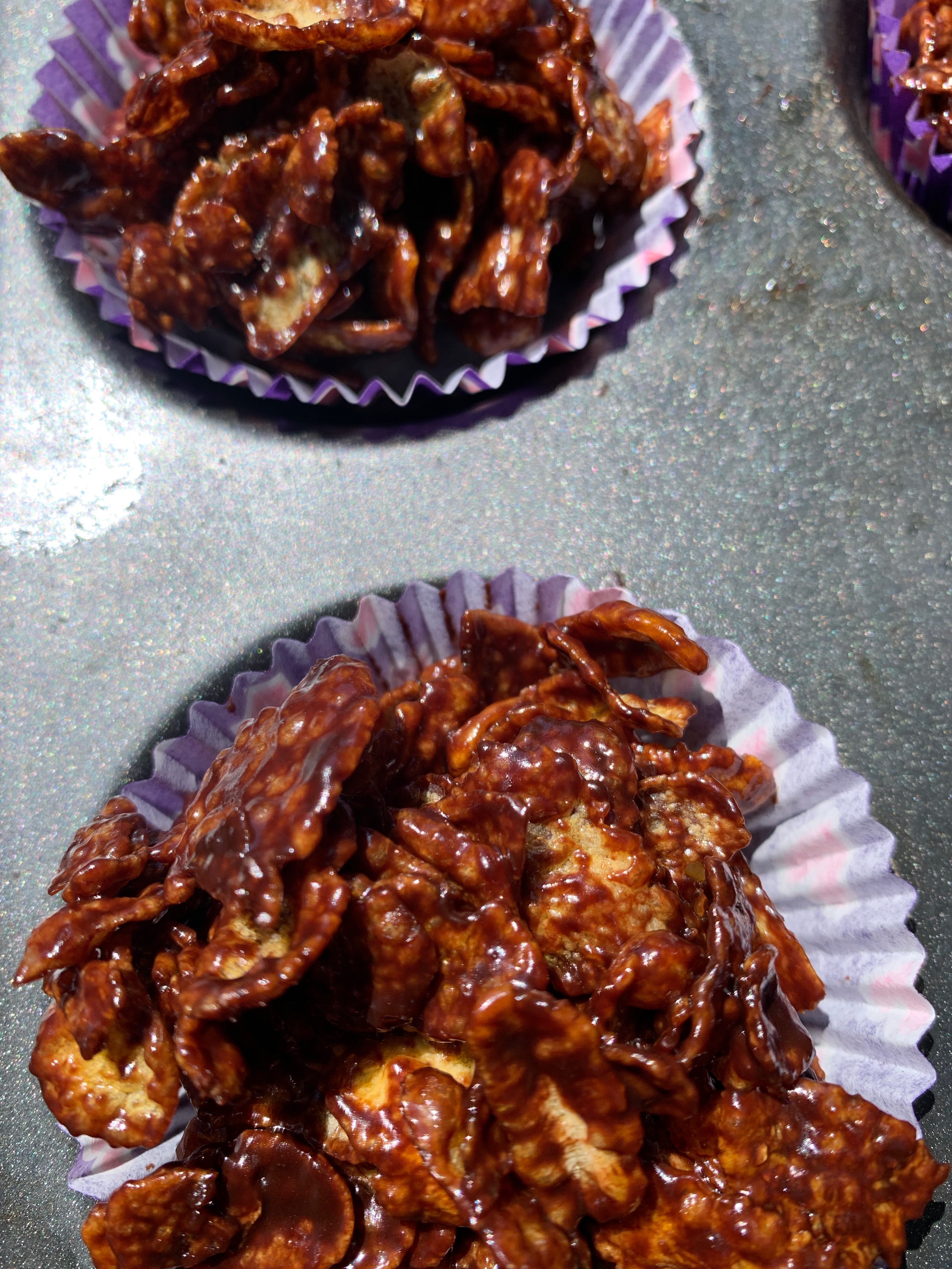 3. Leave to cool slightly then toss in the cornflakes and coat them thoroughly with the sugary chocolate mixture.