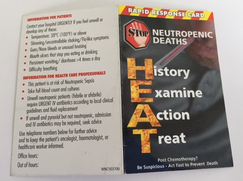 Eileen is very much onwards and upwards and lifts my spirits with her challenges. I show her the HEAT card that the oncologist says I must read to check on adverse symptoms after chemo and we agree that the medical terms defeat us.