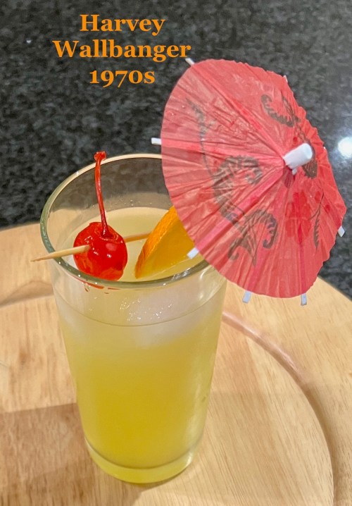 The Harvey Wallbanger cocktail is in my book Cream Horns and Vol au vents with stories from the 1970s. A boyfriend at the time took me to the bar at the top of the Hilton Hotel and this cocktail was my choice. Made from vodka, Galliano, orange juice and lots of ice and served in a high ball glass deorated with lots of clutter – paper umbrella, orange slice, cherry with a stalk. It tastes rather sweet and girly now for 2025 tastes.