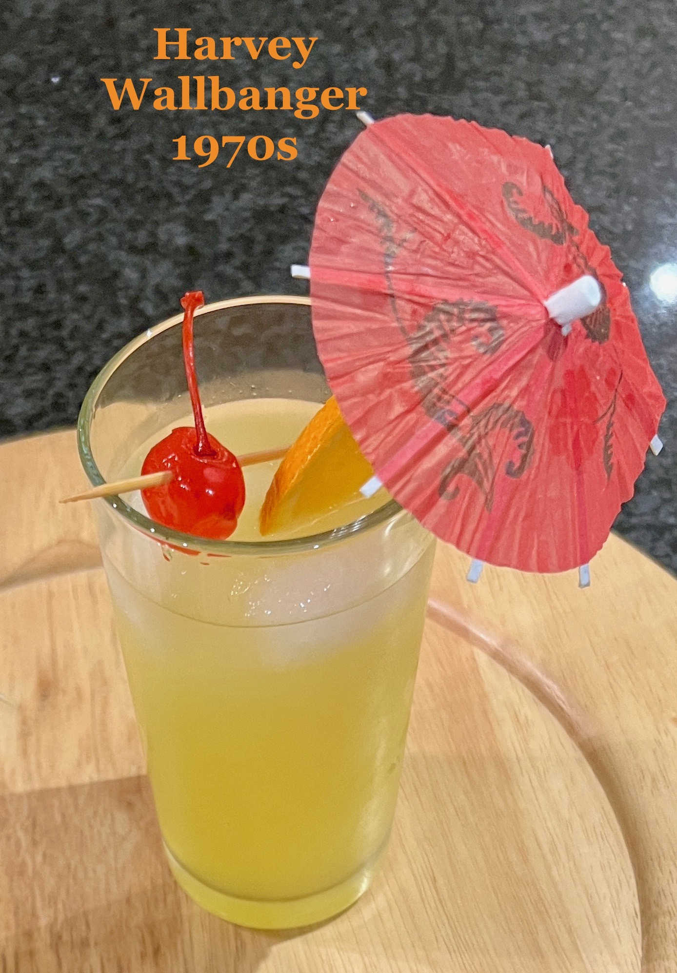 The Harvey Wallbanger cocktail is in my book Cream Horns and Vol au vents with stories from the 1970s. A boyfriend at the time took me to the bar at the top of the Hilton Hotel and this cocktail was my choice. Made from vodka, Galliano, orange juice and lots of ice and served in a high ball glass deorated with lots of clutter – paper umbrella, orange slice, cherry with a stalk. It tastes rather sweet and girly now for 2025 tastes.